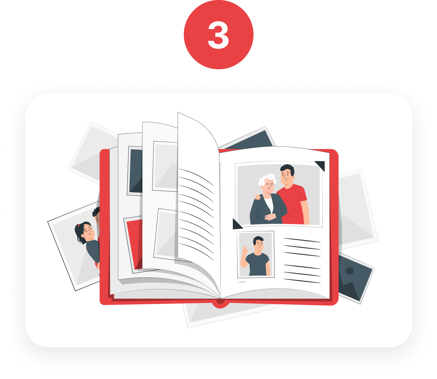 Laissez-vous guider sur notre plateforme pour que votre (grand) parent raconte l'histoire de chaque photographie à son rythme en toute simplicité !